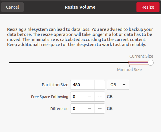 选择文件系统对应分区,点击齿轮设置,调整大小“Resize”