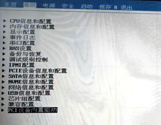 1、进入BIOS、高级设置,选择PCI设备内置驱动器