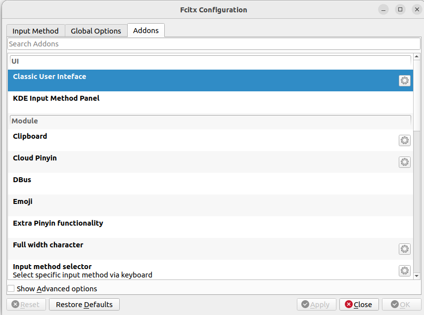 - fcitx5-chinese-addons :中文输入扩展包,也是必装组件,包含了我们常用的拼音、双拼等多种中文输入方式